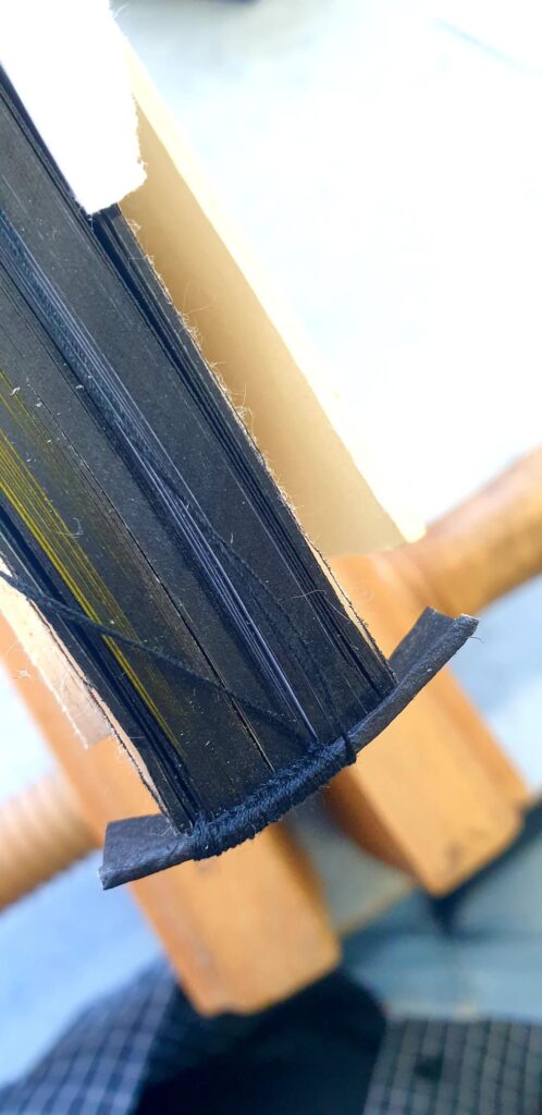 Dar­über hin­aus ermu­tig­ten mich mei­ne Aus­bil­de­rin und Kol­le­gen auch dazu, tech­ni­sche und gestal­te­ri­sche Risi­ken ein­zu­ge­hen. In die­sem Fall war dies das Anfer­ti­gen von Vor­satz­la­gen mit Leder­fäl­zel. Auch das hand­ge­sto­che­ne Kapi­tal war für mich eine Her­aus­for­de­rung, da die mono­chro­me Sei­de detail­lier­tes Arbei­ten auf so klei­nem Maß­stab schwie­rig machte.