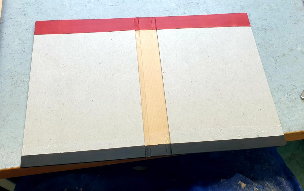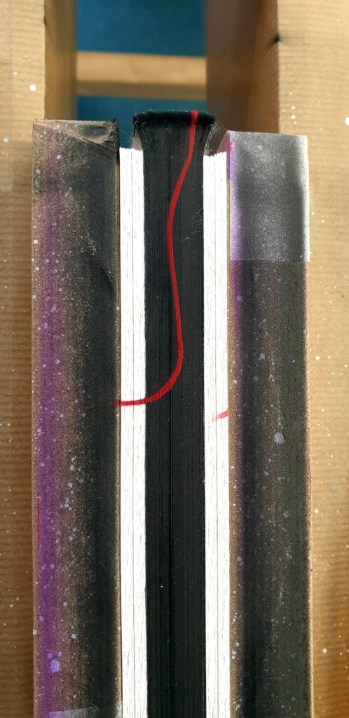 Für die Her­stel­lung habe ich mich an dem Aus­bil­dungs­leit­fa­den ori­en­tiert und Tech­ni­ken gewählt, die dem zwei­ten Lehr­jahr ent­spre­chen. In mei­nem Fall war dies ein Edel­papp­band: Also ein Ein­band, des­sen Kan­ten zum Schutz mit Leder­schie­nen ver­se­hen sind und mit Papier über­zo­gen ist. Wegen mei­nem kon­kre­ten Gestal­tungs­kon­zept habe ich mich dazu ent­schie­den, sowohl Leder als auch Papier selbst mit der Air­Brush zu fär­ben. Dies gab mir grö­ße­re Frei­heit, hoch­wer­ti­ge Aus­gangs­pa­pie­re und ‑Leder zu wäh­len und farb­lich per­fekt auf­ein­an­der abzustimmen.