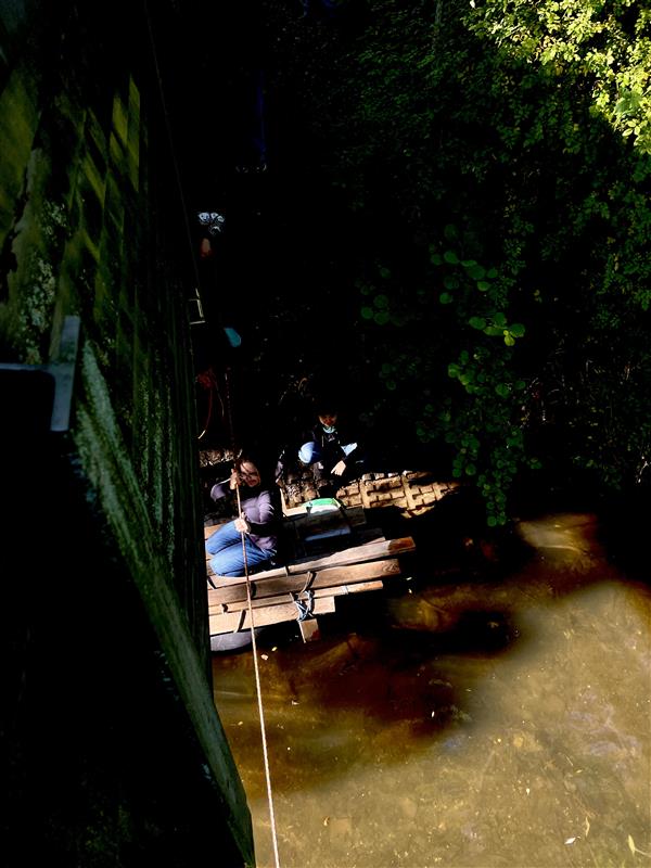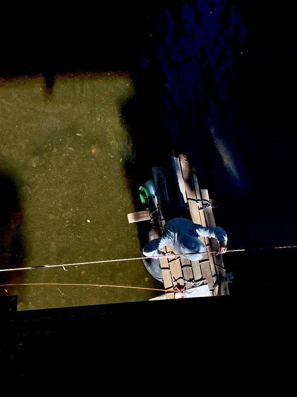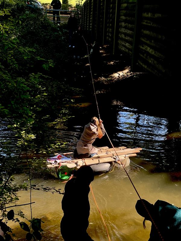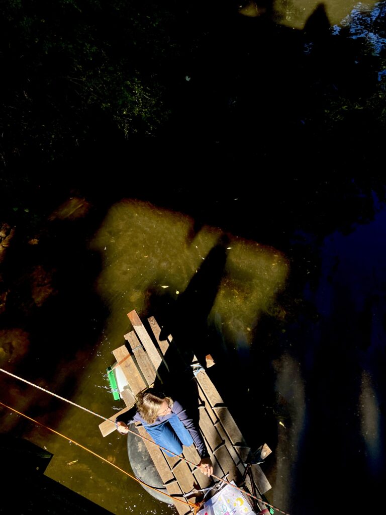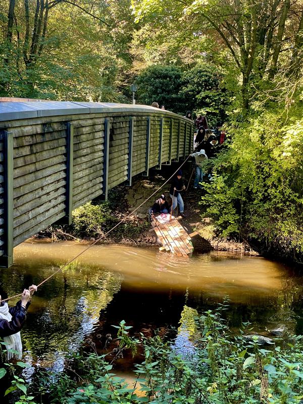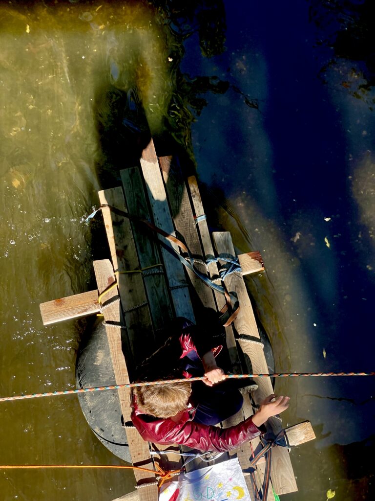 Nach eini­gen Übun­gen zum Auf­wär­men und sich Ken­nen­ler­nen stell­ten sich die Schüler*innen der Her­aus­for­de­rung aus weni­gen beschränk­ten Mit­teln wie Holz­bret­ter, Fäs­ser, LKW-Schlauch, Spann­gur­te und Sei­le gemein­sam ein Floß zu bau­en, auf dem sie nach­ein­an­der tro­cke­nen Fußes die Alb in Form einer Seil­fäh­re über­que­ren konnten.