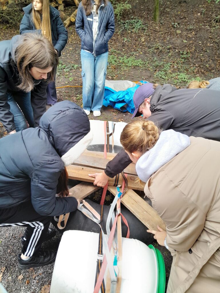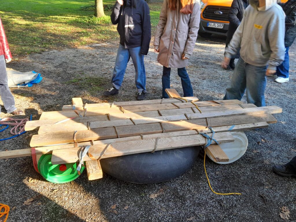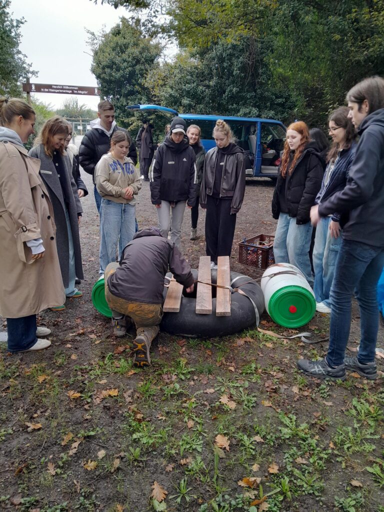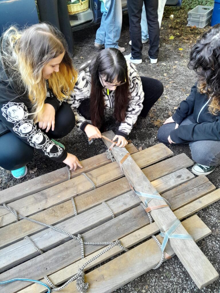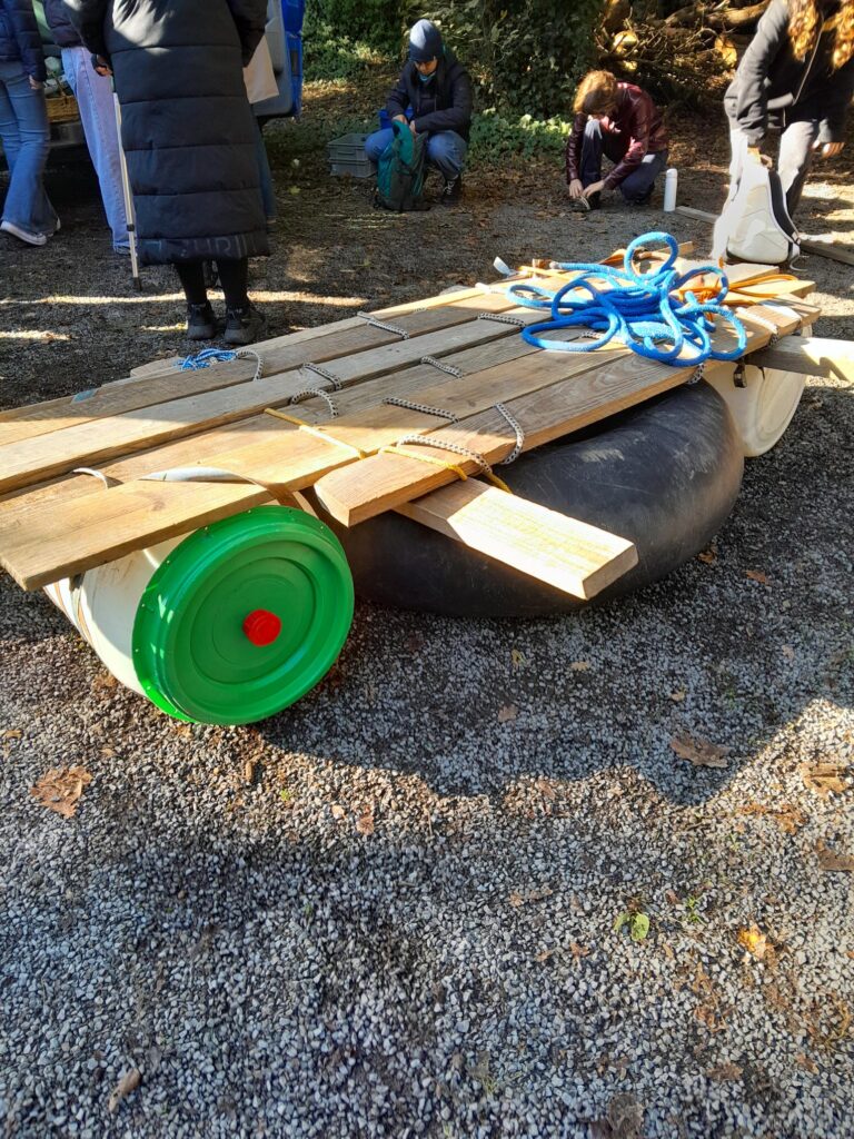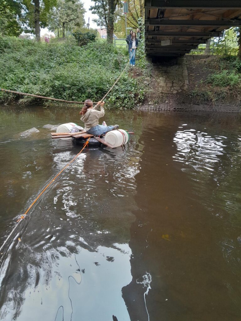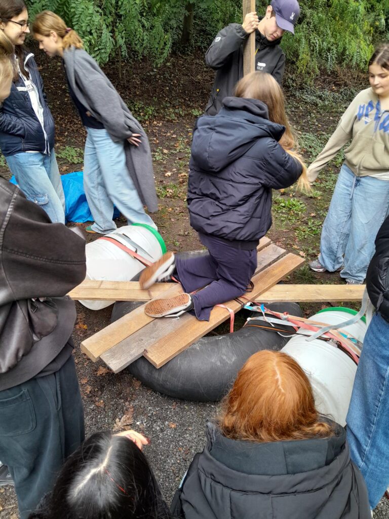 Nach eini­gen Übun­gen zum Auf­wär­men und sich Ken­nen­ler­nen stell­ten sich die Schüler*innen der Her­aus­for­de­rung aus weni­gen beschränk­ten Mit­teln wie Holz­bret­ter, Fäs­ser, LKW-Schlauch, Spann­gur­te und Sei­le gemein­sam ein Floß zu bau­en, auf dem sie nach­ein­an­der tro­cke­nen Fußes die Alb in Form einer Seil­fäh­re über­que­ren konnten.