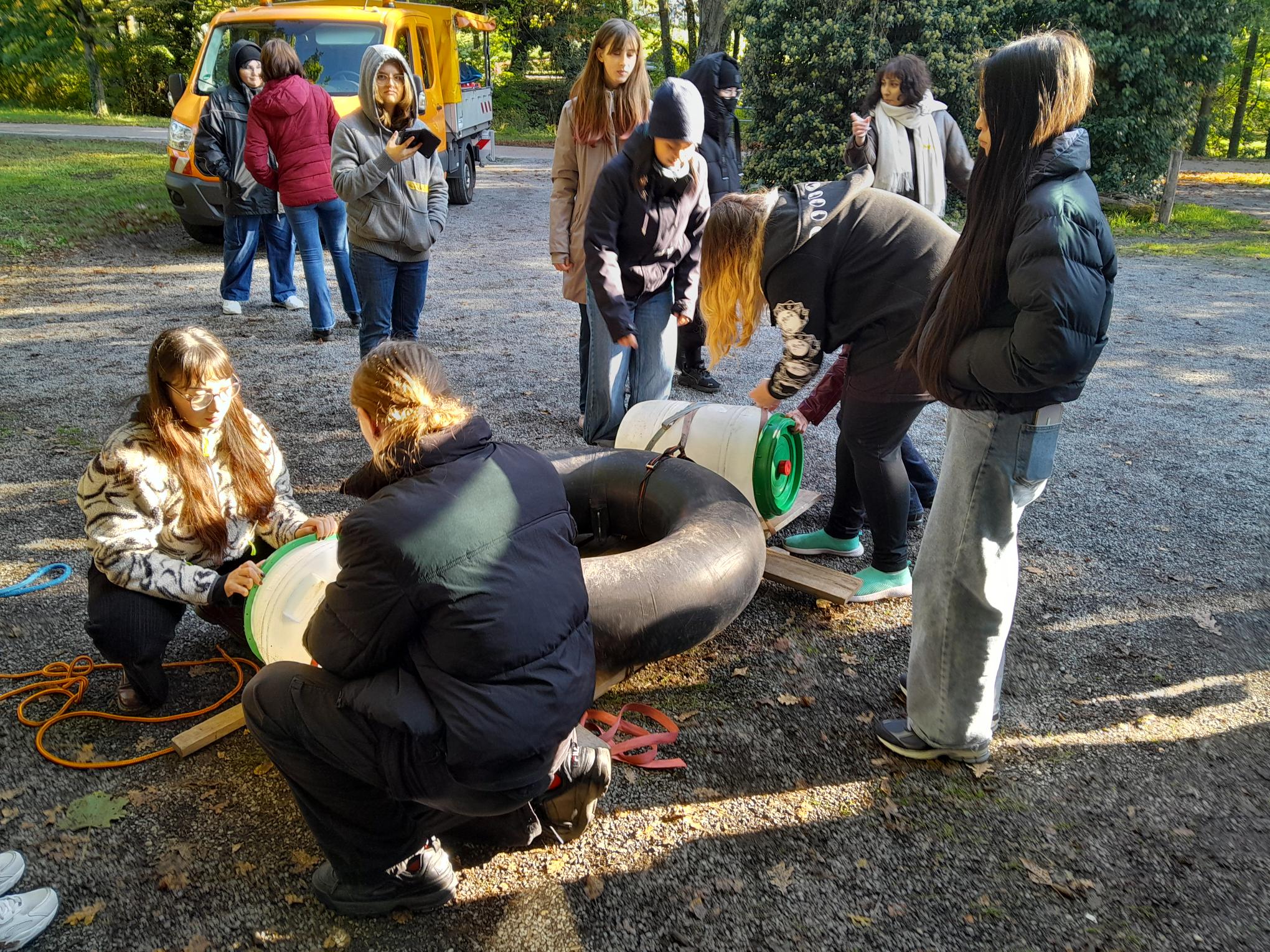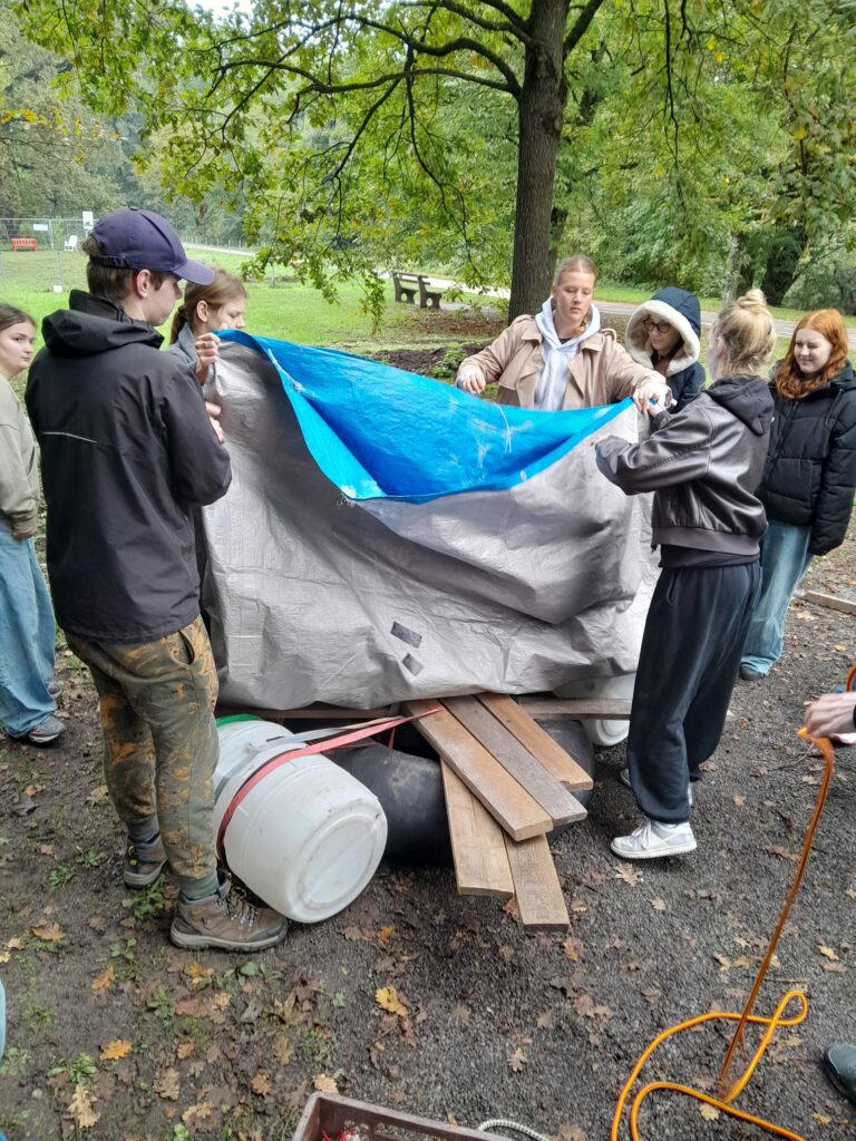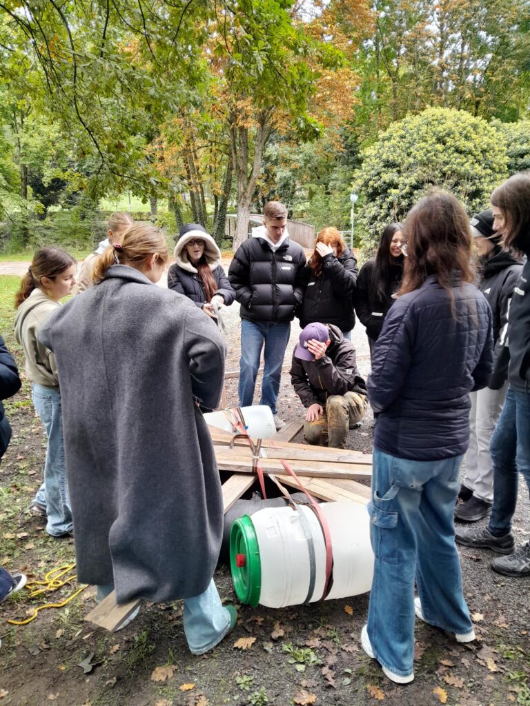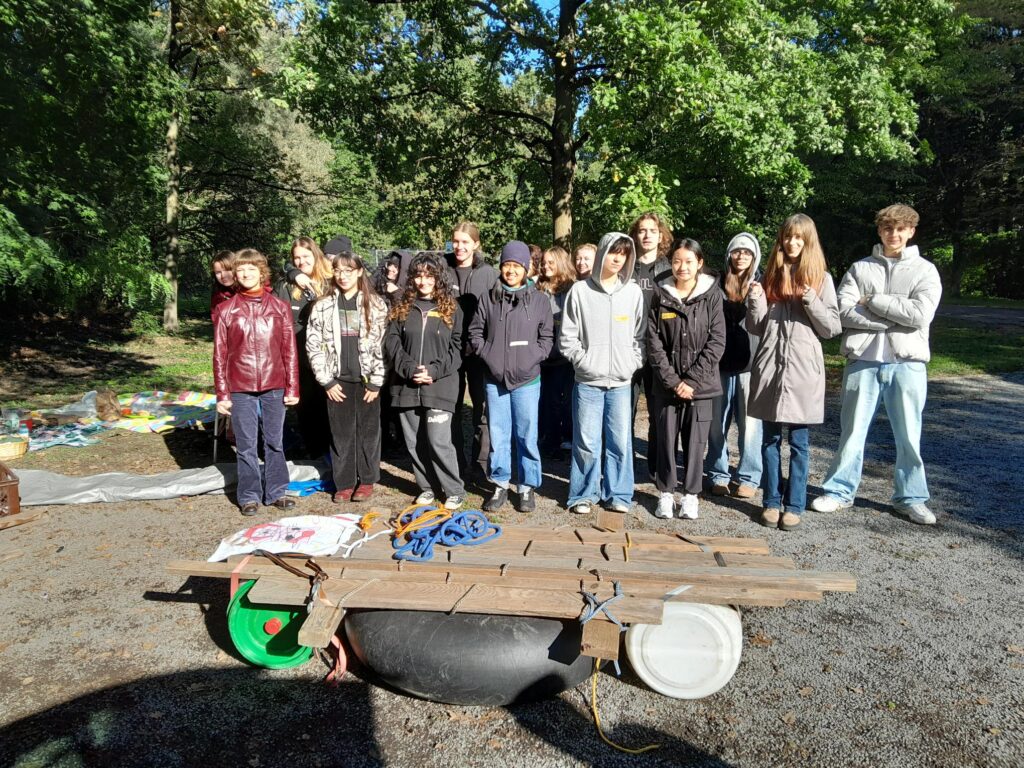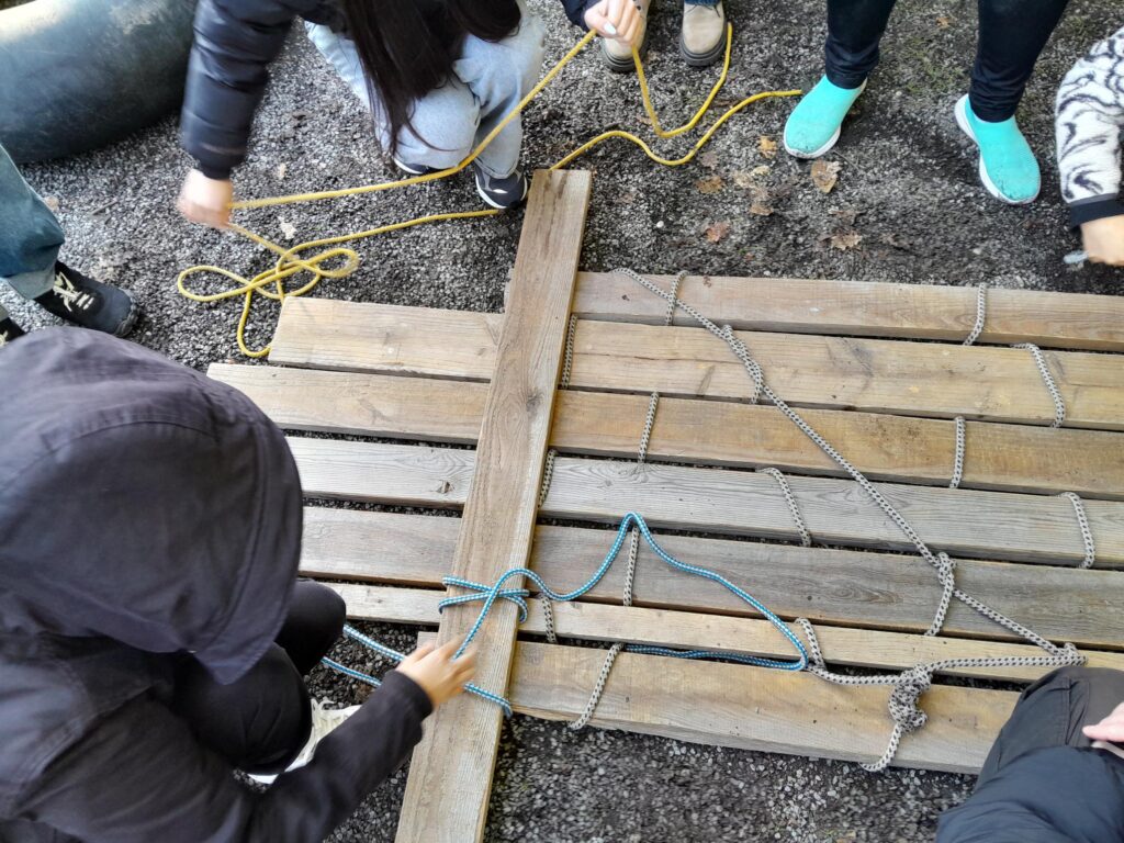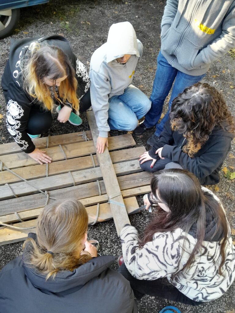 Nach eini­gen Übun­gen zum Auf­wär­men und sich Ken­nen­ler­nen stell­ten sich die Schüler*innen der Her­aus­for­de­rung aus weni­gen beschränk­ten Mit­teln wie Holz­bret­ter, Fäs­ser, LKW-Schlauch, Spann­gur­te und Sei­le gemein­sam ein Floß zu bau­en, auf dem sie nach­ein­an­der tro­cke­nen Fußes die Alb in Form einer Seil­fäh­re über­que­ren konnten.