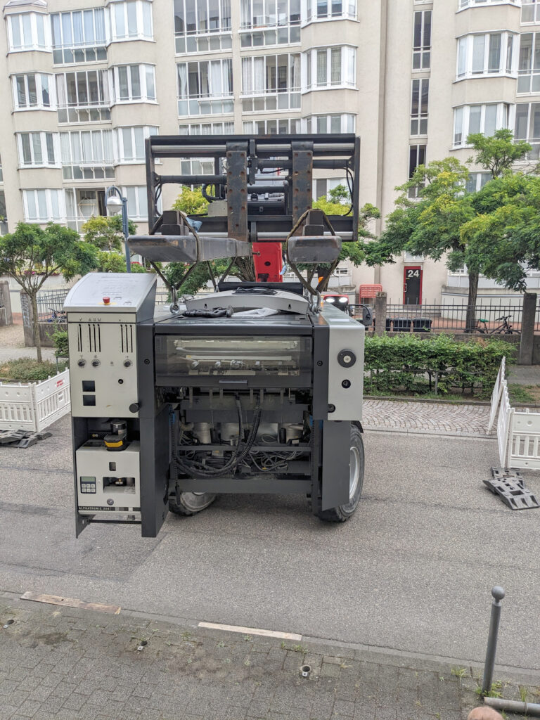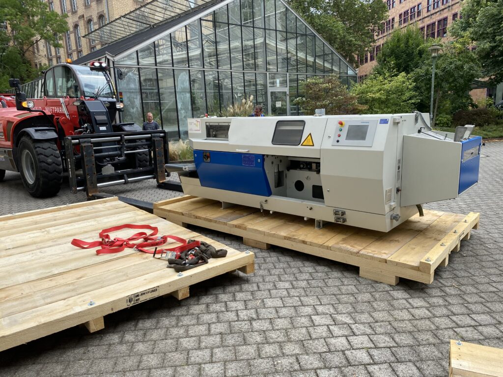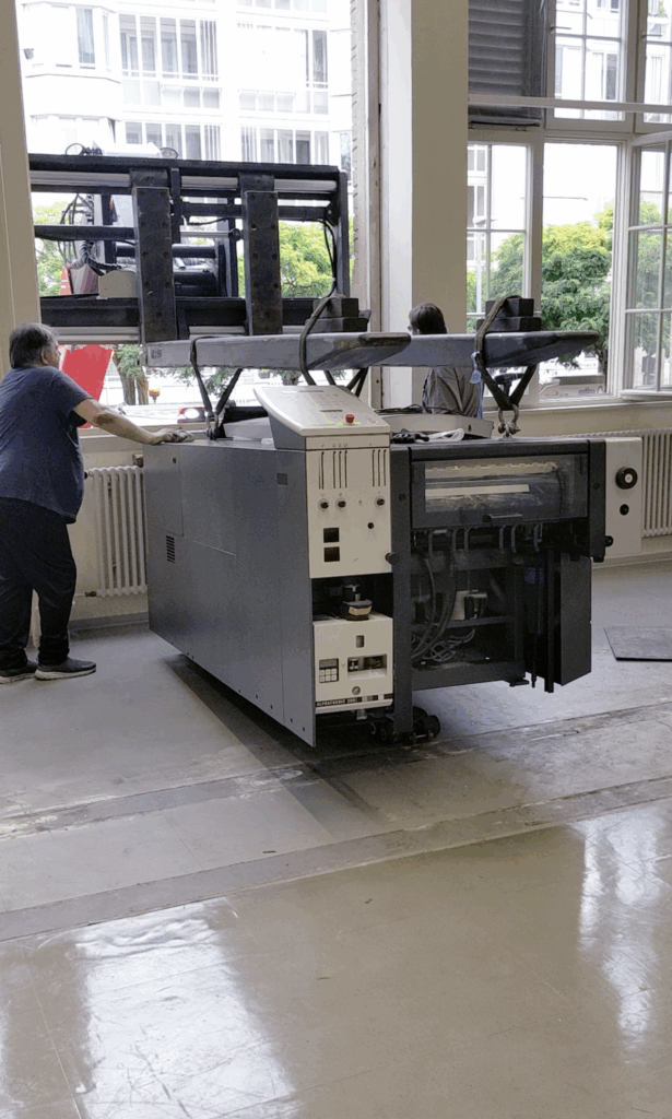 Die Maschi­ne wur­de im Rah­men einer groß ange­leg­ten Akti­on durch die Stadt Karls­ru­he in unse­rer Druck­werk­statt in Raum 110 instal­liert. Da das Schul­ge­bäu­de unter Denk­mal­schutz steht, muss­ten bei der Instal­la­ti­on beson­de­re Vor­keh­run­gen getrof­fen wer­den. Eine dar­auf spe­zia­li­sier­te Fach­fir­ma über­nahm den sach­ge­rech­ten Aus­bau der denk­mal­ge­schütz­ten Fens­ter, um Schä­den an der his­to­ri­schen Sub­stanz zu ver­mei­den. Auch die Stra­ße vor der Schu­le muss­te für meh­re­re Tage gesperrt wer­den – ein logis­ti­scher Kraft­akt, der mit hohen Kos­ten ver­bun­den war, aber den Weg für eine moder­ne und pra­xis­na­he Aus­bil­dung ebnete.