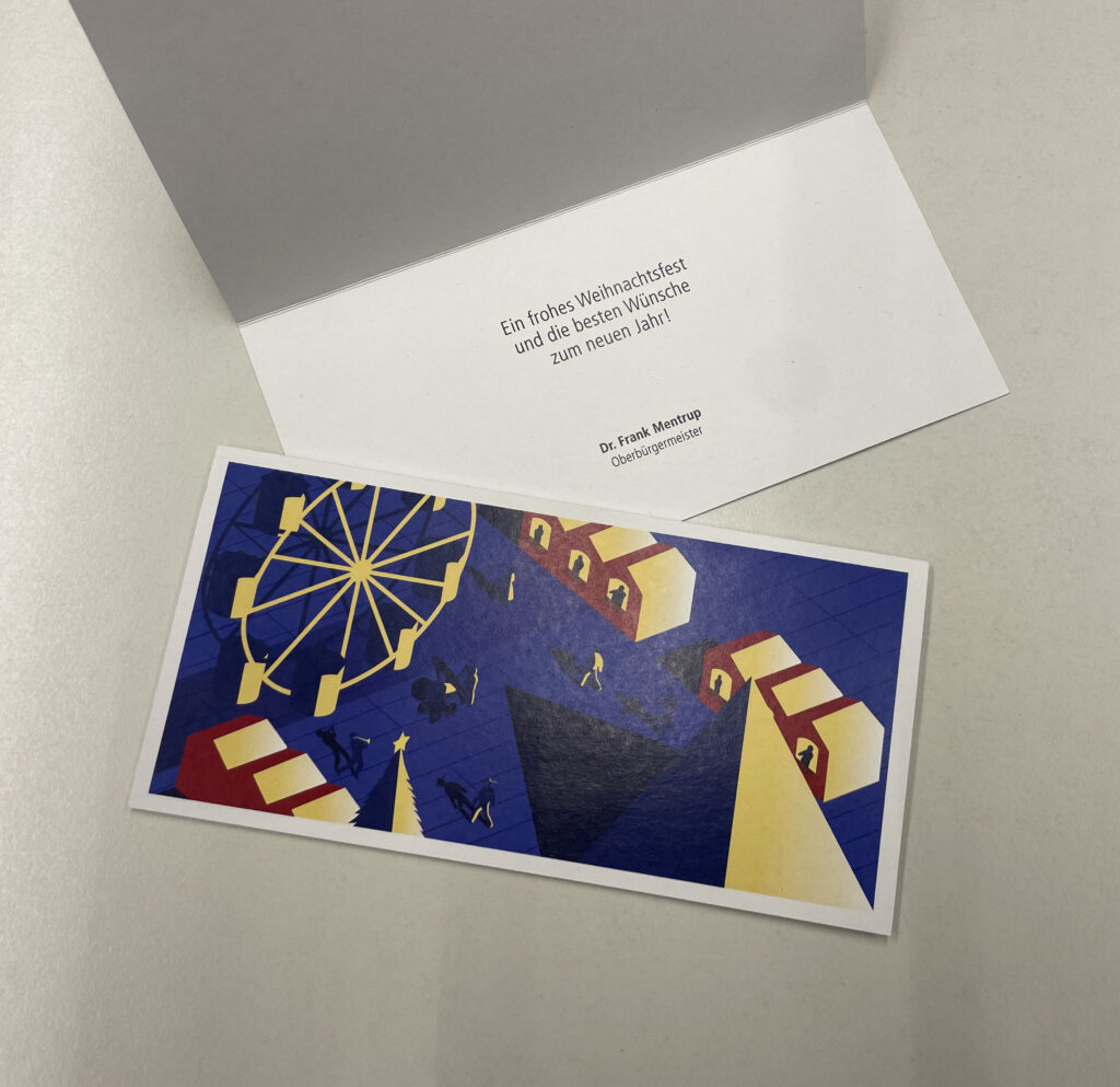 Die Schülerinnen und Schüler des Berufskollegs Grafik-Design (BKGD) der Carl-Hofer-Schule konnten dieses Jahr ihre gestalterische Expertise für den Oberbürgermeister Dr. Frank Mentrup unter Beweis stellen: Im Rahmen eines Praxisprojekts entwarfen sie eine offizielle Weihnachts- und eine Silvesterkarte für das Hauptamt der Stadt Karlsruhe. Die Entwürfe von Maja Pierza (Weihnachten) und Felizitas Schmitt (Silvester) wurden ausgewählt und zieren nun die festlichen Wünsche des OBs.